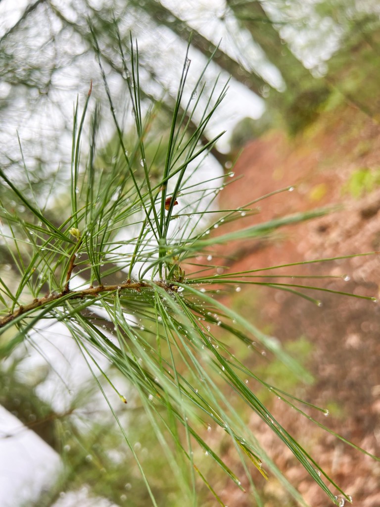 The water droplets hung onto the tips of the green pine needles like jewelry worn to accessorize the wearer—not overbearing, but noticed. Water droplets from the morning fog are still lingering here and there over the lake. Waiting for a destination, either fall to the ground below or wait for the heat from the rising sun to evaporate them back to the air to fall once again at some point.