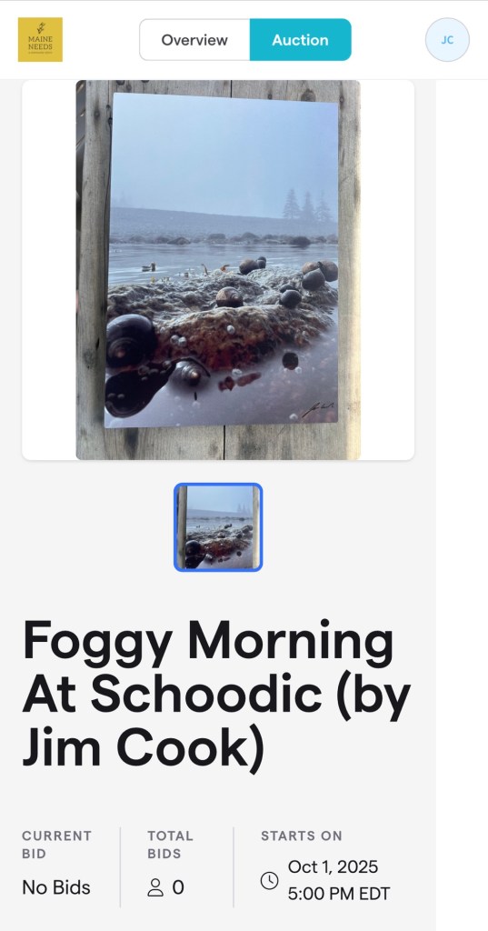 I am supporting Maine Needs with a donation of a 14×20 mental photo, entitled “Foggy Morning At Schoodic” (image attached), for their annual fundraising event on Wednesday, October 1. The auction is both live and online. Follow this link to see all the artwork that is part of the auction – https://givebutter.com/c/artforopp/auction/categories/46978/paintings
