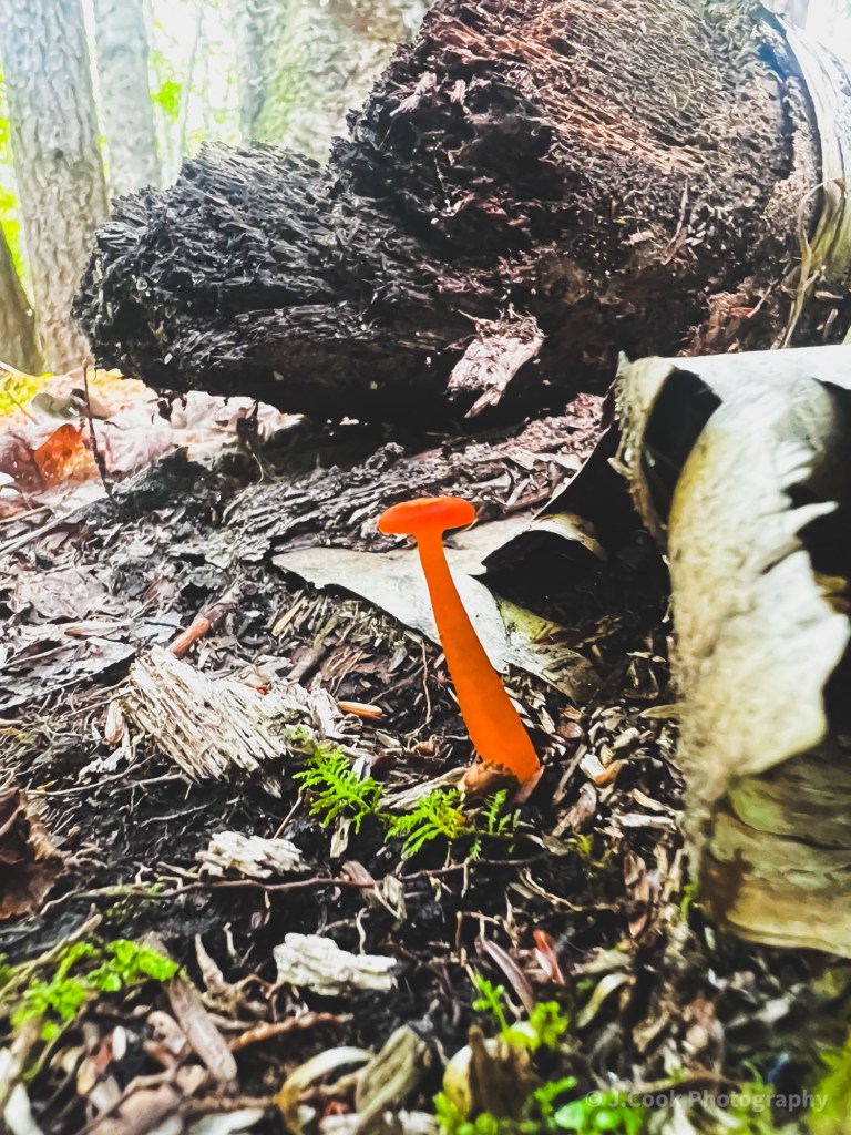 Just off a short trail, among the fallen, decaying birch trees, grow the small orange fugues. They shot up past the grays and greens spread across the forest floor. Their presence causes me to stop and wonder if there is another, smaller world these fugues are part of. Some questions remain unknown. I continued along on my walk in the woods, happy to have seen these fugues and glad I got a few photos of them.