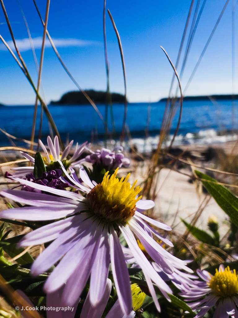 Aromatic Asters blooming along the Maine Coast with the blue coastal waters.  Blooming from late summer through September, they keep the beauty of nature going, providing me with a photo opportunity.