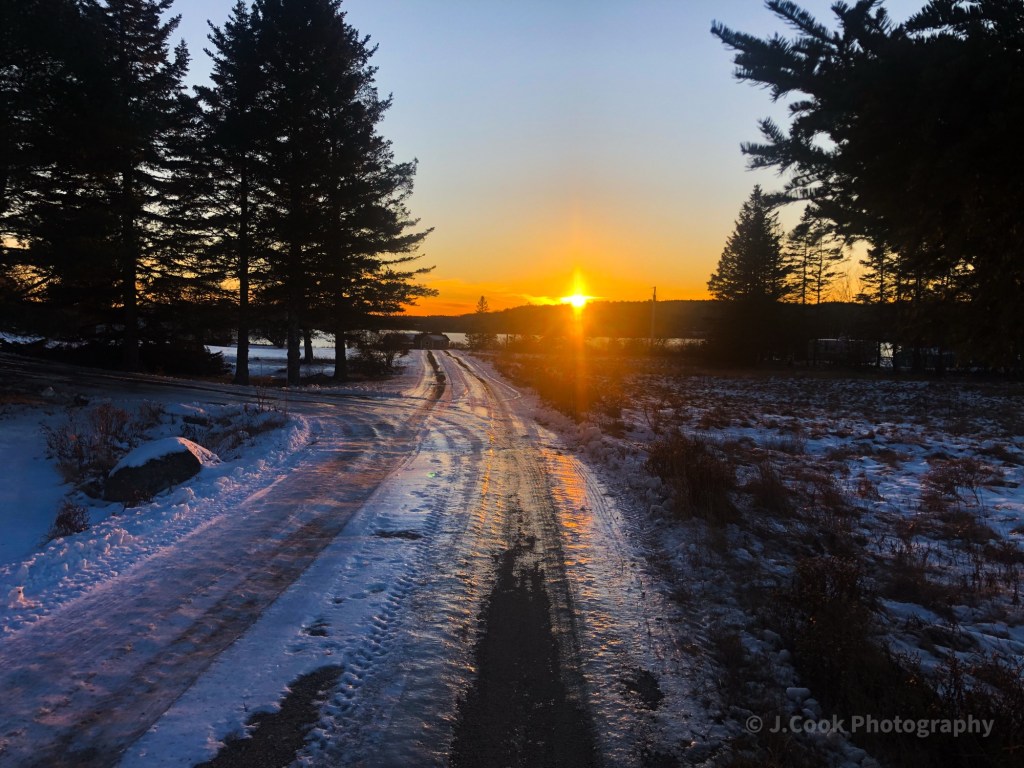 Walking down a country road in the winter as the sun sits on the horizon. The reflection of the light off the uneven ice adds to the scene before me. I always enjoy sunsets here, as each one is different in its unique way. I’m fortunate, as there are many places life takes me to which have amazing sunrises or sunsets, some places having both. Not everyplace has either.