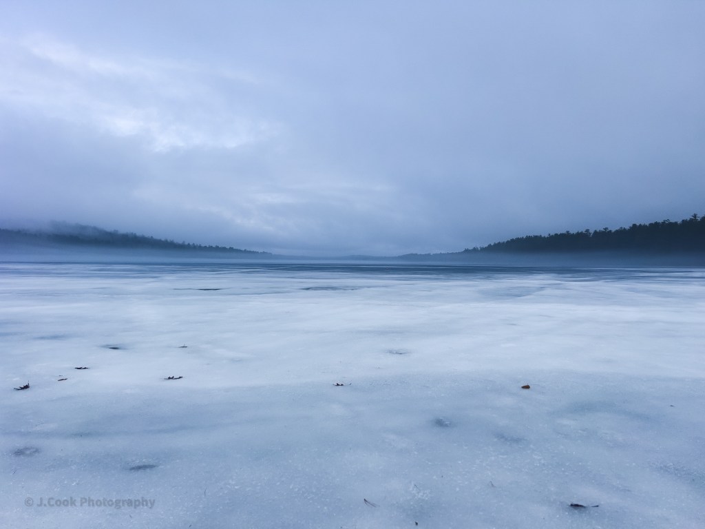 Woods Pond last week, with winter still holding on for a few more days. Snow and ice with a low-hanging fog bank creating the appearance of an almost white-out scene.