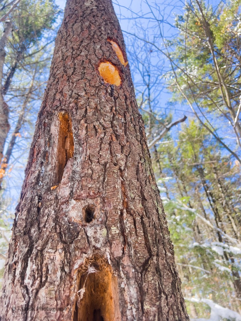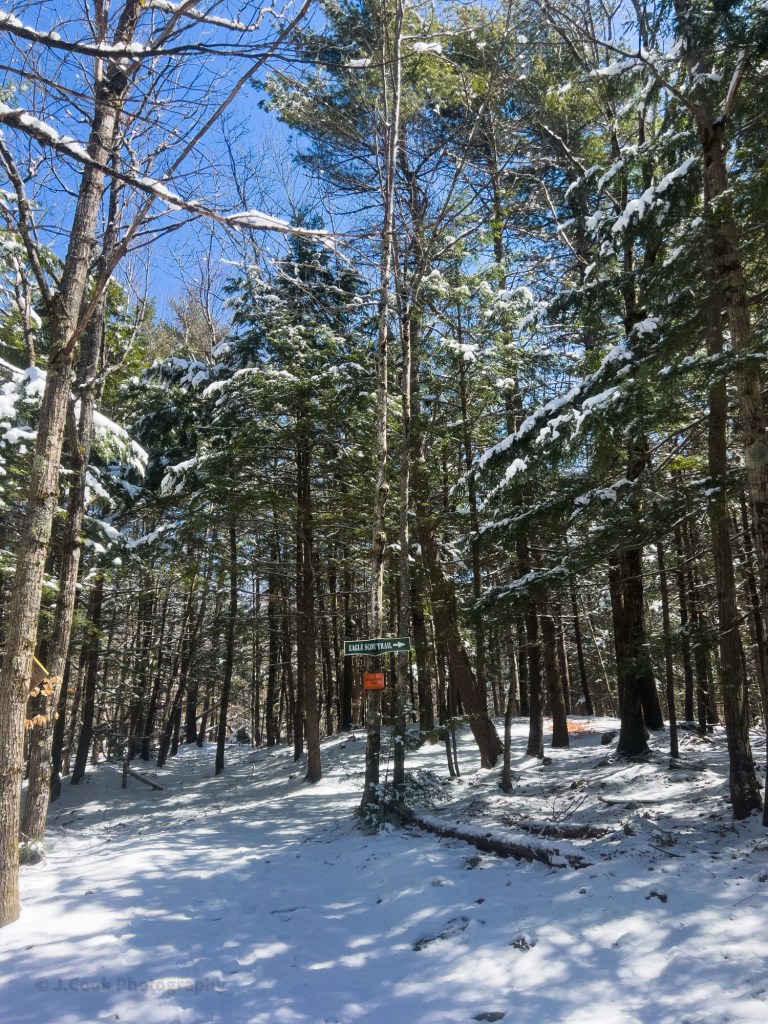 I started on the Eagle Scout trail from the parking lot into a mixed forest. The trail was mostly snow-covered from a recent spring snowstorm. The trail appeared to parallel a snowmobile path for a bit, between the recent snow and the fading orange trail marks on the trees; it would be easy to get off trail. There were a few other spots, too, where I needed to look around for the next orange mark; sometimes they were only a few feet apart, others a few further. The few big turns were well marked. I personally find that in situations like these, I tend to look at the lay of the land, where it looks like a path has been made, a bit tougher when the ground is snow-covered.