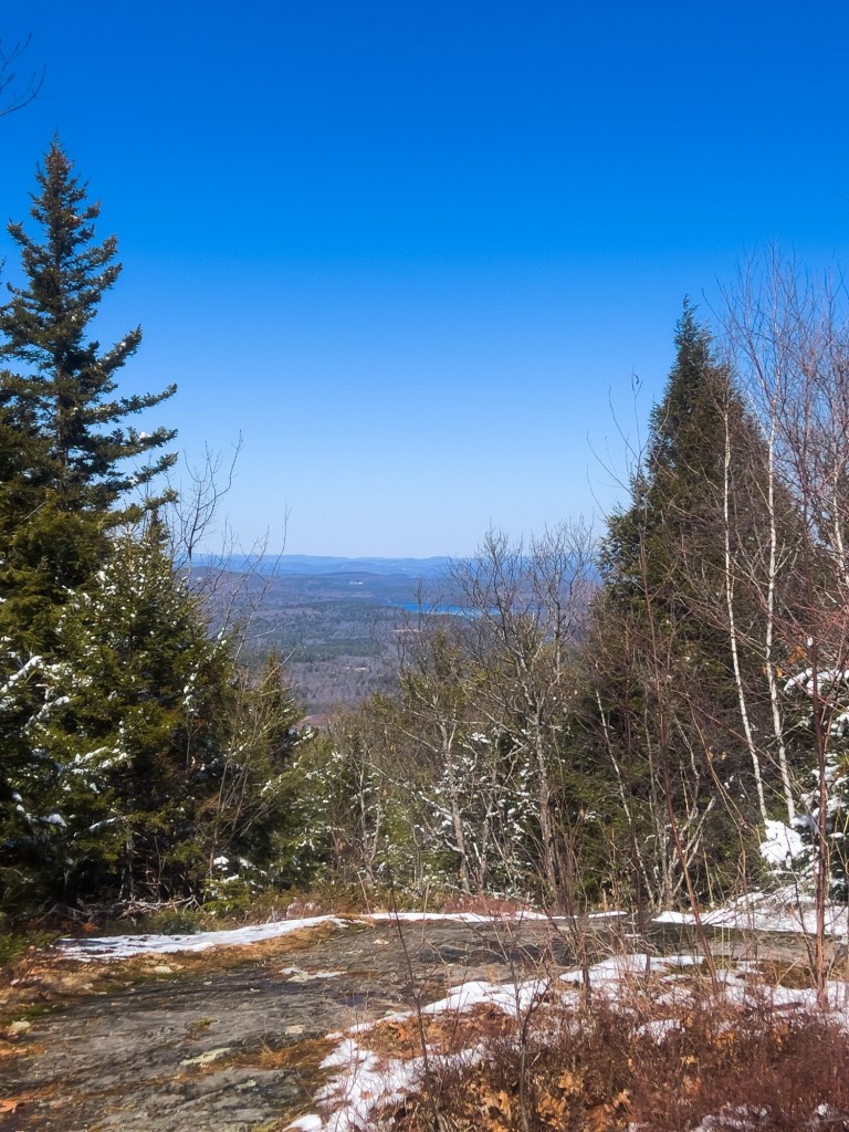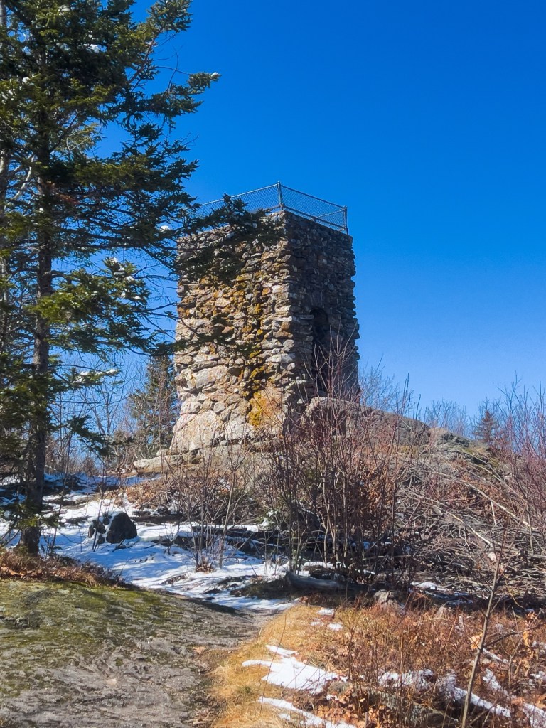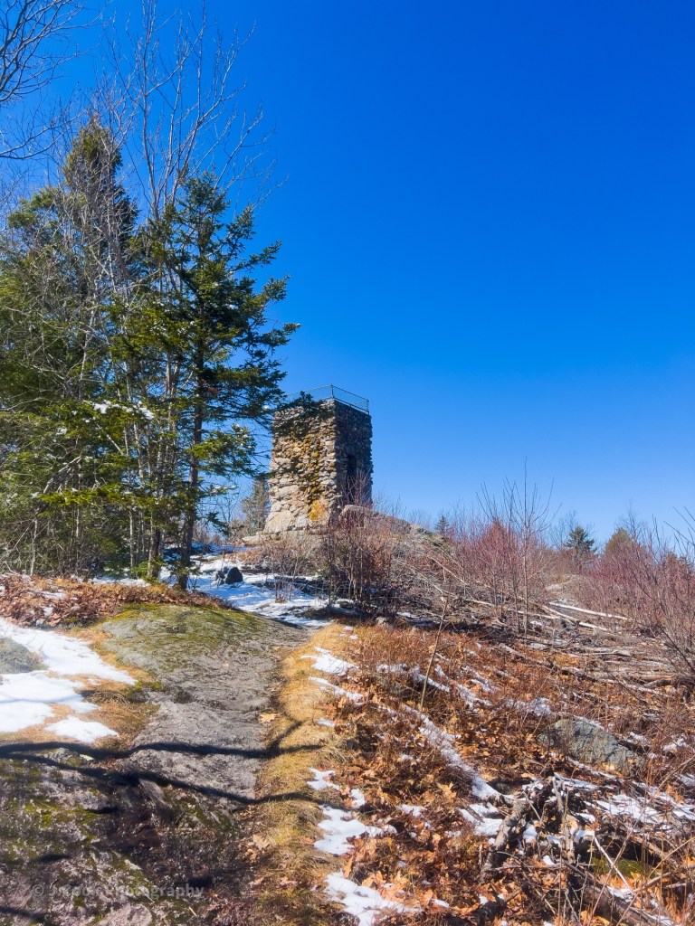 I had the summit to myself. The views from atop the stone tower did not disappoint on this sunny day. Snow covered Mountain Washington to the west and the blue waters of Sebago Lake to the east.