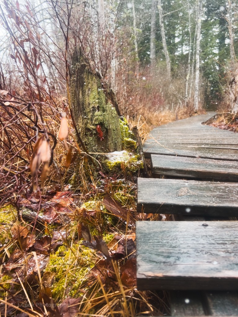 I was walking on the trails of the Holt Preserve not too long ago. As I made my way along the wooden bog bridges, I came upon the remains of a tree, a stump. Covered in the green of a moss with a few white dots mixed in. The red leaves of a plant are positioned just right. These are the pieces of nature‘s artwork that I look for as I wander through the woods. Sometimes there are many such spots that jump out at me, other times I only come upon one or two.